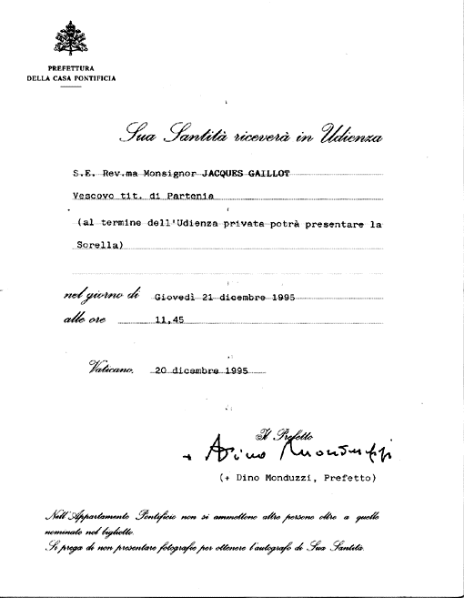 La invitación oficial del VaticanoEsta invitación es uno de los escasos documentos que se refieren a Jacques Gaillot como "obispo de Partenia". Puede ver una copia de esta invitación aquí. |